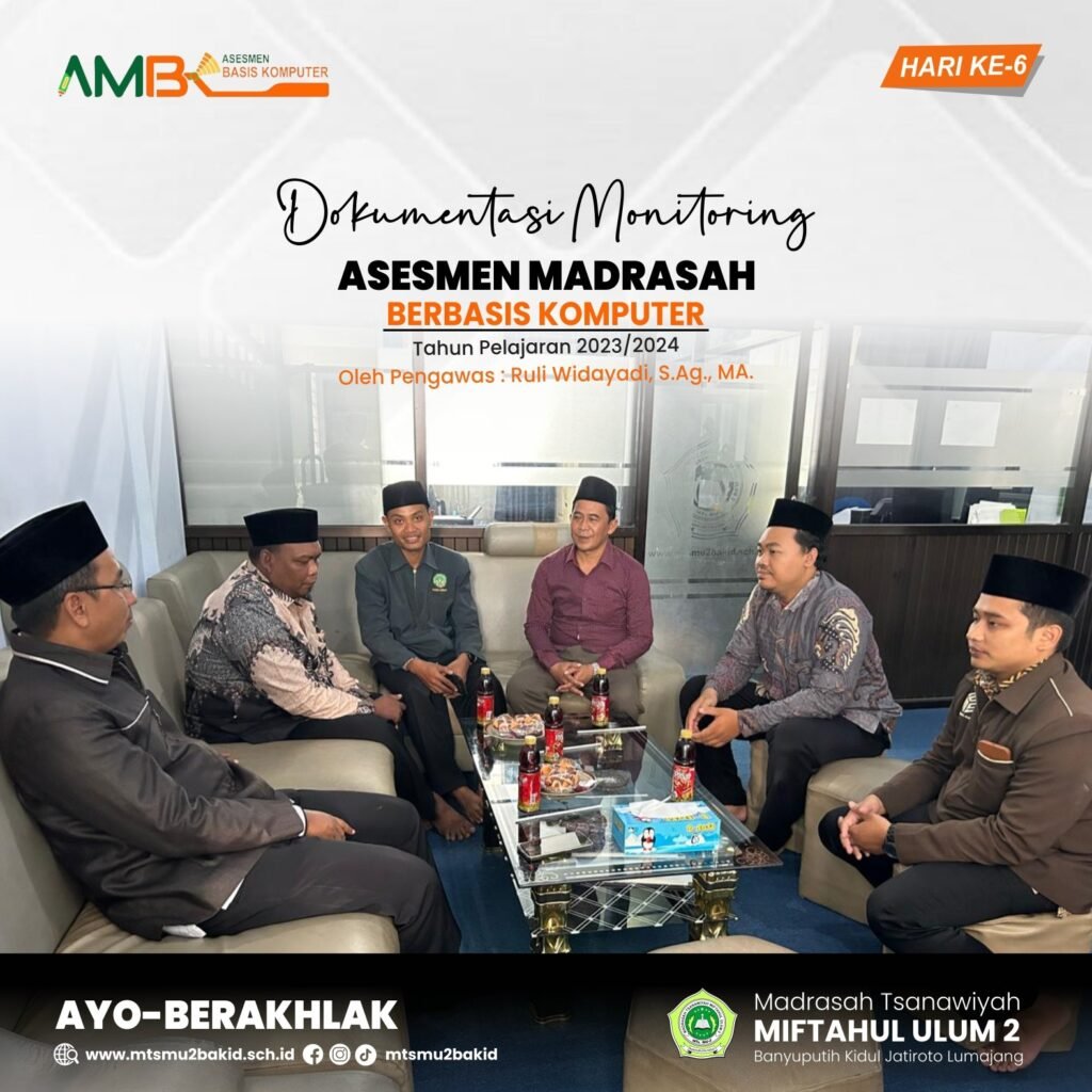 Selasa (07/05/2024), civitas MTs. Miftahul Ulum 2 kedatangan Pengawas Bina Bapak Ruli Widayadi, S.Ag., MA dalam rangka monitoring pelaksanaan Asesmen Madrasah Berbasis Komputer (AMBK) TP.2023/2024. Disambut langsung oleh Kepala Madrasah H. Ahmad Fauzi, S.Pd.I dengan ditemani pengawas ruang serta panitia AMBK, bapak pengawas bina itu mengutarakan maksud kedatangannya untuk memantau jalannya asesmen untuk peserta didik di Kelas IX sesuai intruksi dari Bapak Kasie. Pendma H. Hasanuddin, M.Pd.I.
