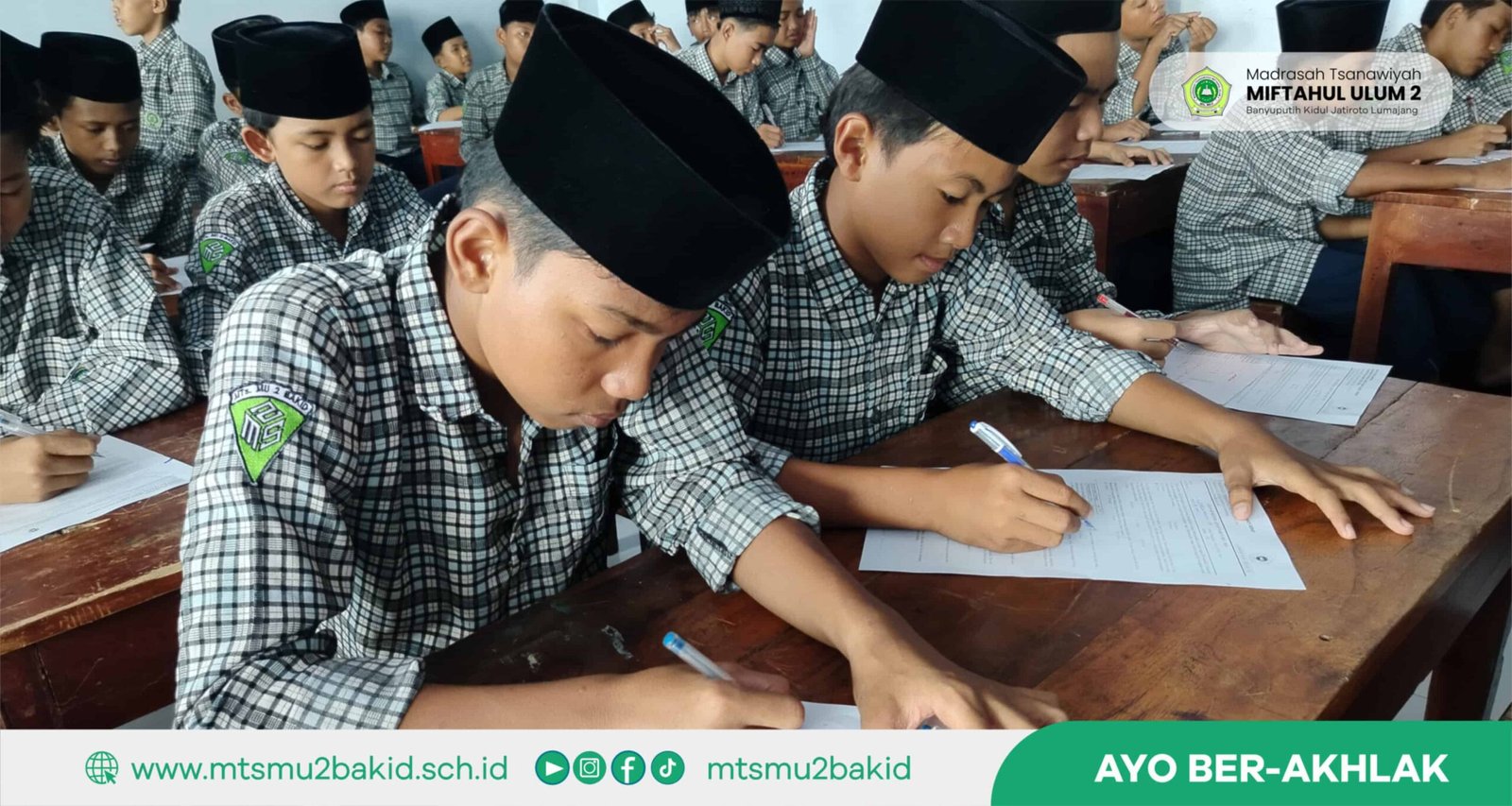Pelaksanaan Asesmen Sumatif Akhir Tahun (ASAT) Tahun Pelajaran 2024/2025 di MTs Miftahul Ulum 2 Banyuputih Kidul telah memasuki hari keempat. Kamis (29/05/25). Hari ini, para siswa mengerjakan dua mata pelajaran, yakni Bahasa Inggris pada jam pertama dan Akidah Akhlak pada jam kedua.