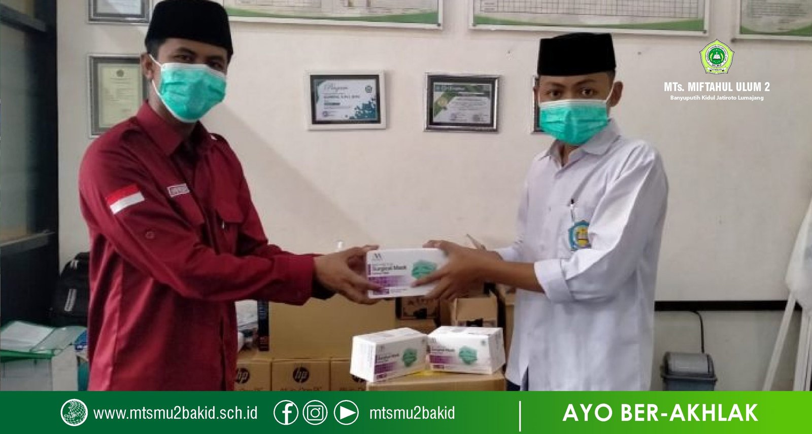 Pembagian alat protokol kesehatan tersebut secara simbolis diserahterimakan kepada pengurus Organisasi Siswa Intra Madrasah (OSIM) di Kantor Madrasah. Para pengurus OSIM pun langsung mendatangi kelas-kelas untuk mendistribusikan masker tersebut kepada ketua kelas masing-masing.