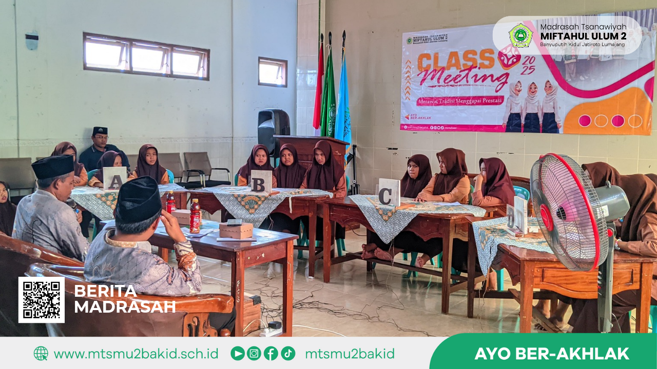 Gelaran Class Meeting Semester Ganjil Tahun Pelajaran 2025/2026 di MTs Miftahul Ulum 2 Banyuputih Kidul memasuki hari kelima pada Ahad, 7 Desember 2025, yang menghadirkan babak final Lomba Cerdas Cermat Terpadu. Kegiatan dilaksanakan di dua lokasi berbeda, yakni Aula Madrasah Lantai 3 untuk peserta putra dan Aula Madrasah Putri Lantai 2 khusus peserta siswi.
