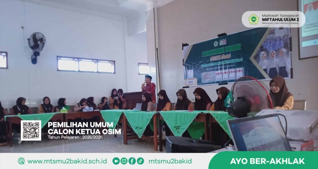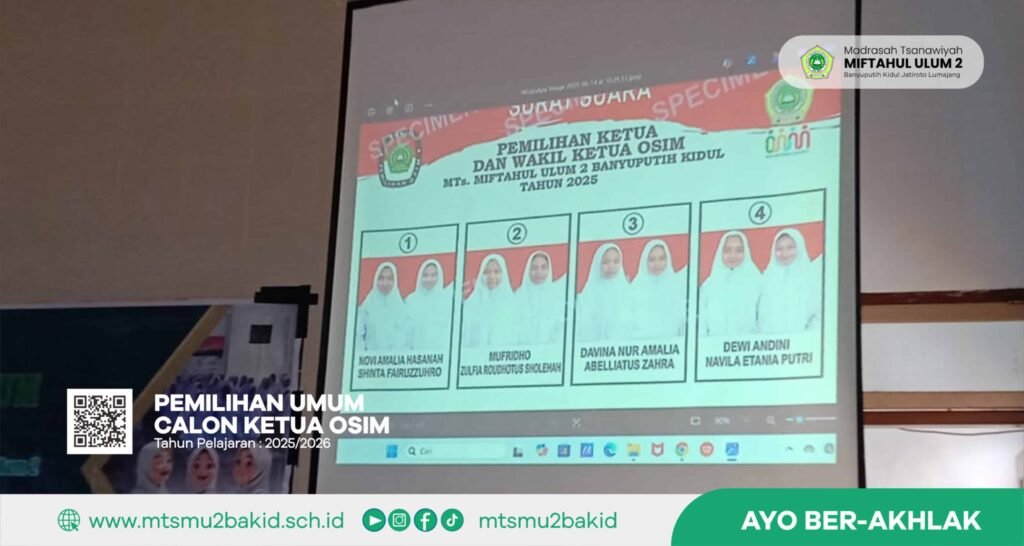 Suasana Aula Gedung Madrasah Putri lantai 2 MTs Miftahul Ulum 2 Banyuputih Kidul Jatiroto Lumajang dipenuhi antusiasme para siswi kelas VII dan VIII. Sabtu (14/06/25). Empat pasangan calon Ketua dan Wakil Ketua OSIM (Organisasi Siswa Intra Madrasah) tahun ajaran 2025/2026 tampil dalam debat terbuka yang digelar sebagai bagian dari rangkaian pemilihan umum OSIM..