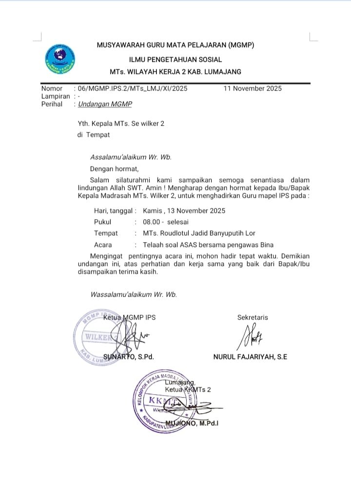 Kegiatan yang berlangsung di MTs Roudlotul Jadid Banyupuh Lor ini diikuti oleh para guru IPS dari madrasah-madrasah di Wilker 2, meliputi Jatiroto, Randuagung, Kedungjajang, dan Klakah. Agenda utama MGMP kali ini adalah “Telaah Kisi-kisi dan Soal ASAS (Asesmen Sumatif Akhir Semester) bersama Pengawas Bina.”