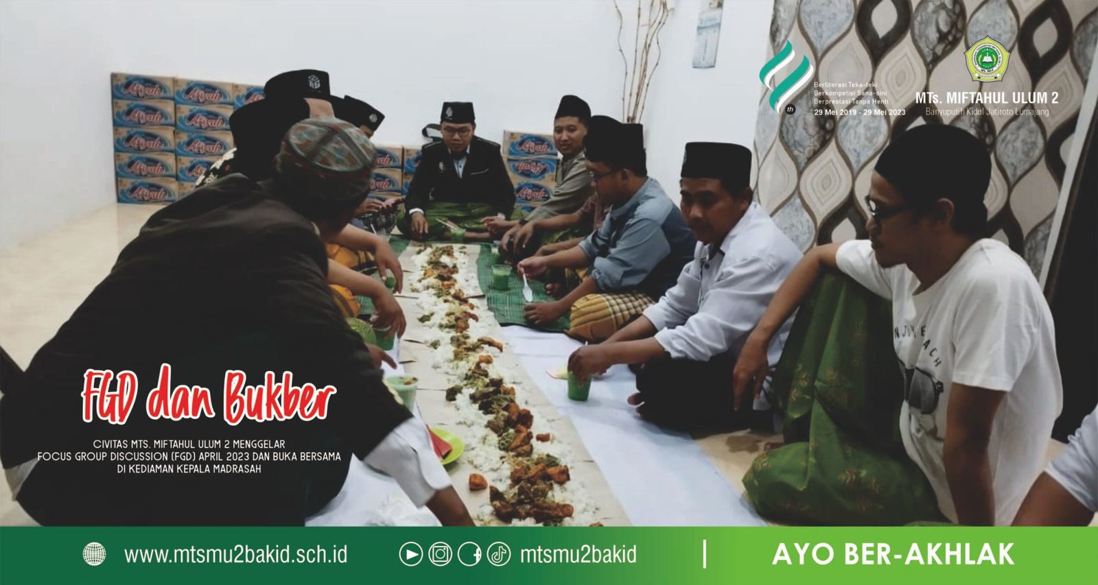 Di penghujung Ramadhan 1444 H, civitas MTs. Miftahul Ulum 2 Banyuputih Kidul Jatiroto Lumajang menggelar Bukber (Buka Bersama) sekaligus agenda rutin bulanan yaitu Focus Group Discussion (FGD) bulan April 2023. Kamis (20/04/23)