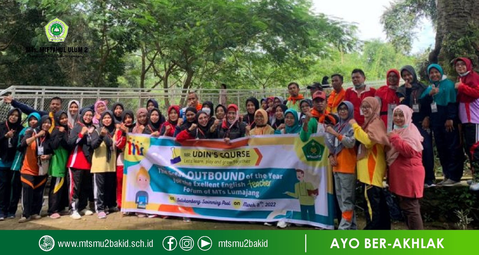 Muhammad Rouf, S.Pd guru Bahasa Inggris MTs. Miftahul Ulum 2 Banyuputih Kidul Jatiroto Lumajang kembali mengikuti Bimtek PKB lanjutan. Berbeda dengan kegiatan sebelumnya, kegiatan MGMP Bahasa Inggris kali ini tidak digelar di dalam gedung aula MTs.N 1 Lumajang tetapi digelar di ruang terbuka yang dikemas dengan kegiatan deoutbound. Kegiatan outbound yang diikuti seluruh anggota MGMP Bahasa Inggris MTs. Se Kabupaten Lumajang dilaksanakan di Wisata Pemandian Alam Selokambang Lumajang, Selasa (08/03/22).