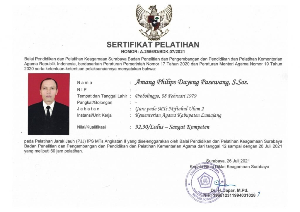 Kementerian Agama Republik Indonesia Balai Diklat Keagamaan Surabaya mengundang salah seorang guru MTs. Miftahul Ulum 2 Bakid Amang Philips Dayeng Pasewang, S.Sos. untuk menghadiri Evaluasi Pasca Pelatihan (EPP) ke Kantor Kementerian Agama Kabupaten Lumajang. Rabu (25/08/21). Di samping itu ada dua yang juga diundang dalam kegiatan tersebut yaitu H. Imron Zamzami, S.H. Pendidikan Pancasila dan Kewarganegaraan MTs dari MTs. Putri Nurul Masyitah Kota Lumajang dan Dewi Noviyanti, S.Pd. (Matematika MA) dari MA. Pester Al-Fauzan Labruk Lumajang.