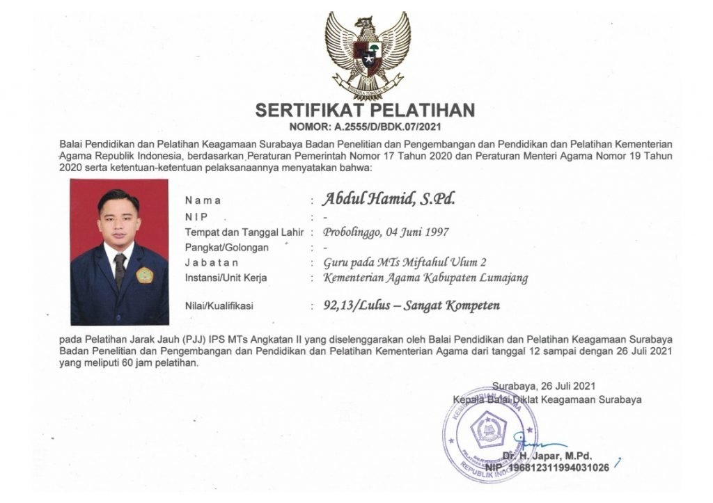 Sekedar untuk diketahui dalam PJJ BDK Surabaya yang diadakan bulan kemarin ada 3 guru MTs. Miftahul Ulum 2 Bakid yang mengikuti kegiatan yang digelar selama 2 pekan tersebut. Ketiga guru tersebut adalah Muhammad Rouf, S.Pd (Guru Bahasa Inggris), Amang Phillip Dayeng Pasewang, Sos dan Abdul Hamid, S.Pd (Guru Mapel IPS). Ketiganya ditetapkan sebagai peserta yang lulus dengan predikat sangat kompeten.