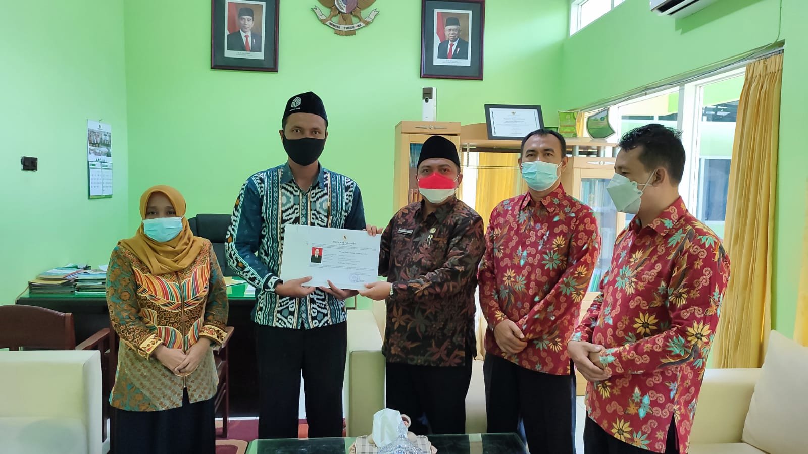 Di akhir kegiatan, Kepala Kemenag Kab. Lumajang Muhammad Muslim, S.Ag, M.Sy mempersilahkan para petugas dari Balai Diklat Keagamaan Surabaya dan para responden untuk beramah-tamah di ruang kerja beliau. Kepala Kemenag Kab. Lumajang yang baru saja menjabat ini memberikan pujian karena nilai yang dicapai salah satu alumnus Diklat PJJ BDK yaitu Amang Philips Dayeng Pasewang,S.Sos guru MTs. Miftahul Ulum 2 Bakid mendapatkan nilai 92,30 dengan predikat sangat kompeten. Selanjutnya beliau meminta untuk foto bersama dengan semua yang hadir di ruangan tersebut.