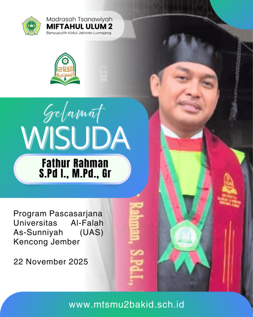 “Kami sangat bangga atas kelulusan ustadz Fathur Rahman dalam program pascasarjana UAS Jember. Ini adalah bukti komitmen beliau untuk terus berkembang dan memberikan yang terbaik bagi madrasah. Semoga ilmu yang diperoleh dapat semakin memperkuat kualitas pembelajaran dan inovasi di MTs Miftahul Ulum 2,” ujarnya.