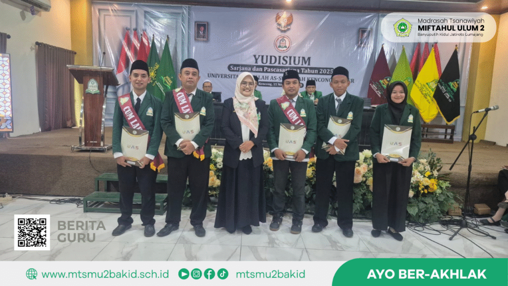 Salah satu guru MTs Miftahul Ulum 2 Banyuputih Kidul kembali menorehkan prestasi akademik membanggakan. Fathur Rahman, S.Pd.I., M.Pd., Gr., resmi diwisuda dalam Program Pascasarjana Universitas Al-Falah As-Sunniyah (UAS) Jember pada Sabtu, 22 November 2025. Tidak tanggung-tanggung, dalam proses sidang terbuka tersebut, pria yang akrab disapa Ustadz Fathur ini ditetapkan sebagai lulusan terbaik dengan capaian luar biasa: lulus dengan predikat Cumlaude dan meraih IPK sempurna 4.0.