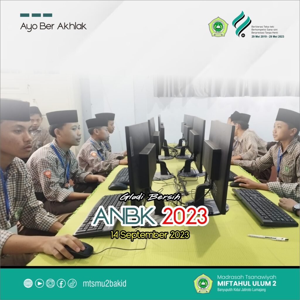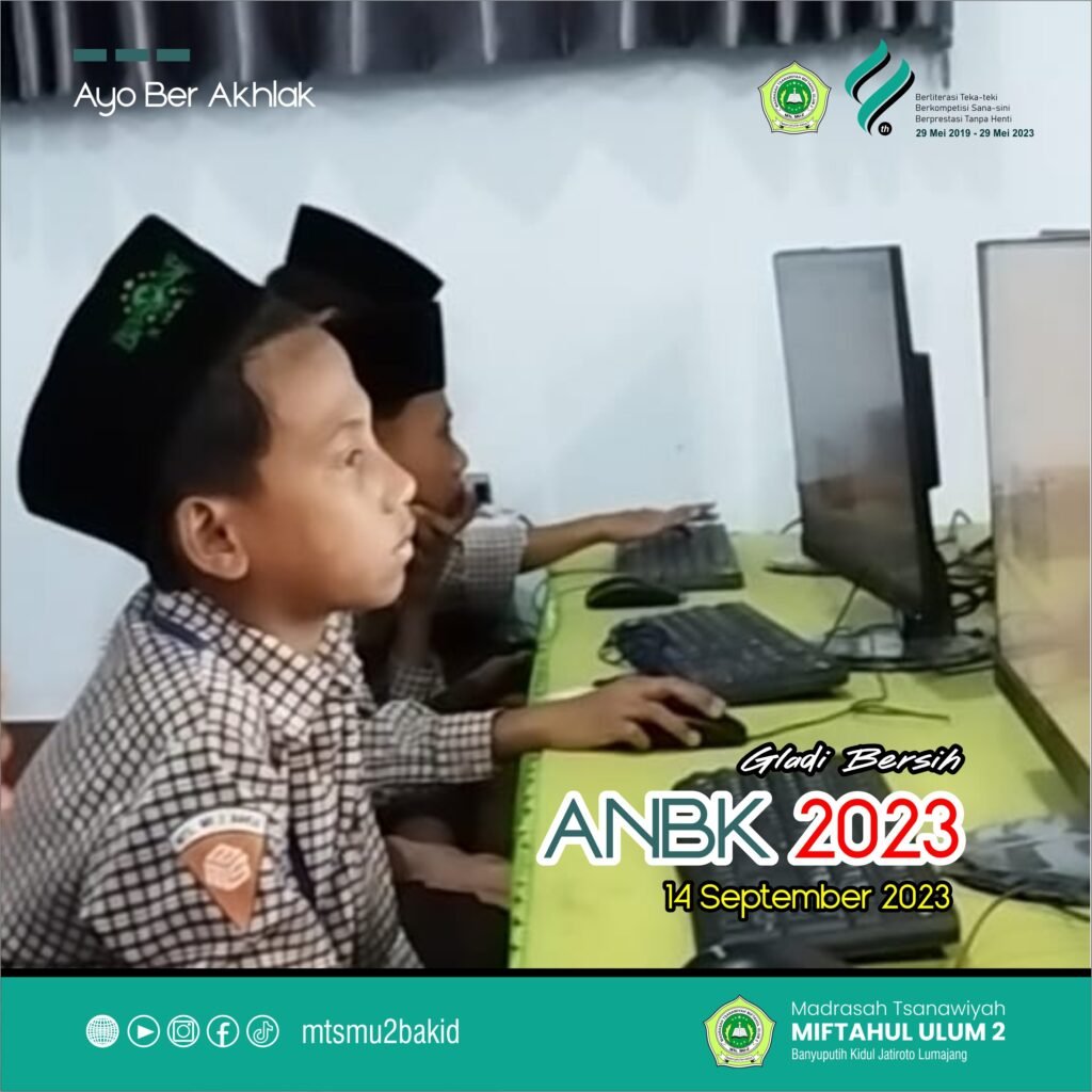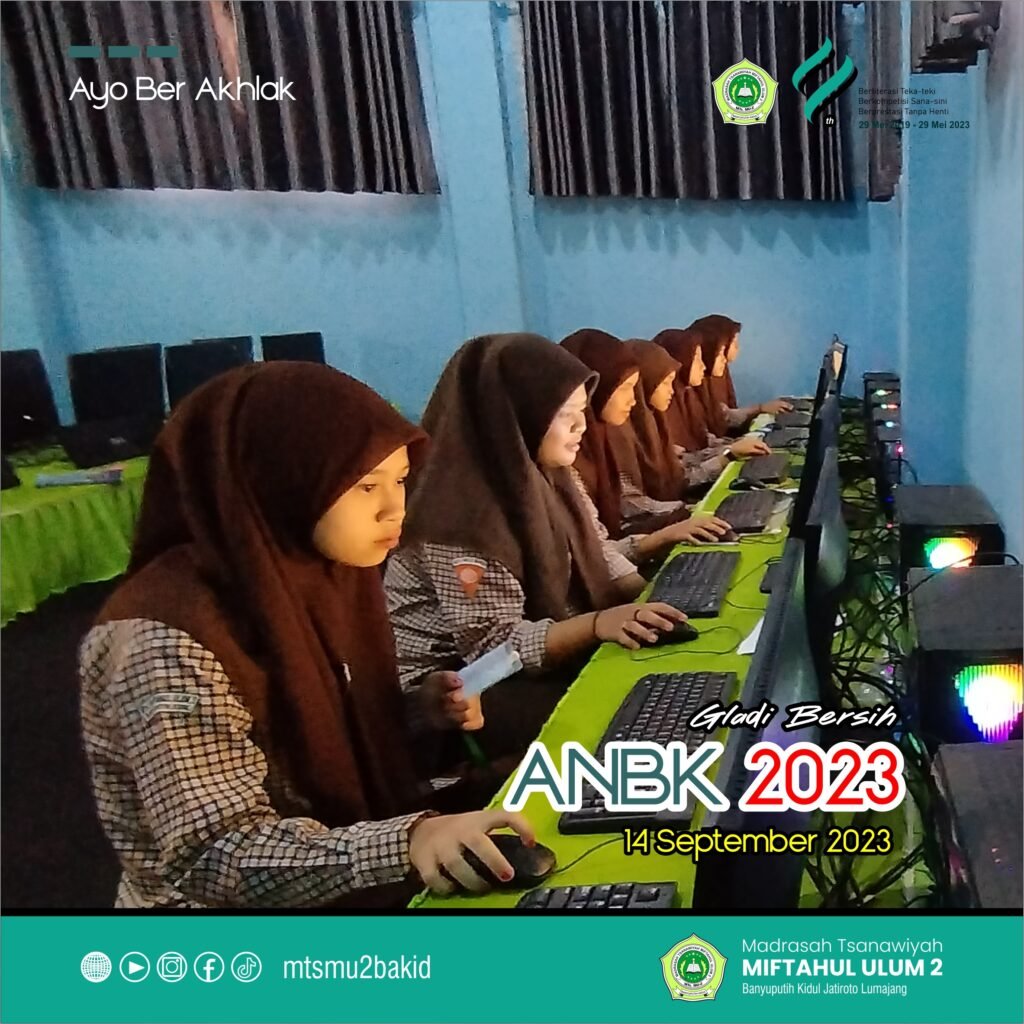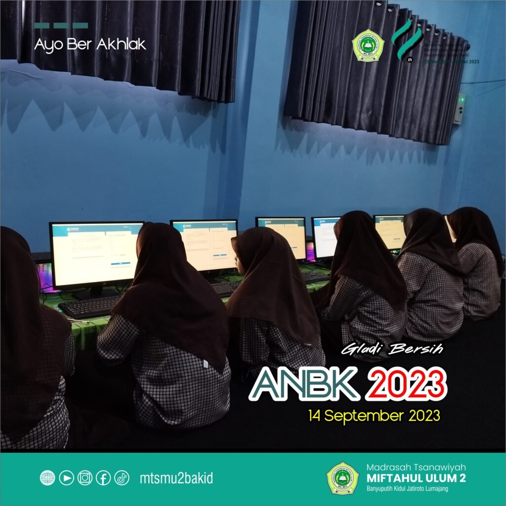 Kegiatan Gladi Bersih Asesmen Nasional Berbasis Komputer (ANBK) di MTs. Miftahul Ulum 2 Banyuputih Kidul Jatiroto Lumajang terus berlanjut dengan sukses pada hari kedua, Kamis (14/09/23). Setelah mencoba mengerjakan materi literasi dan survei karakter pada hari pertama, di hari kedua ini, para siswa mencoba mengenali dan mengerjakan materi numerasi dan survei lingkungan belajar yang diujikan dalam format semi online.