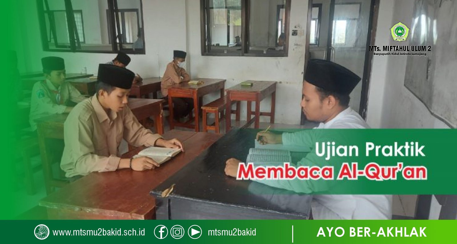 Uji kemampuan membaca Al-Qur’an merupakan materi yang diujikan pada hari kelima sesuai jadwal pelaksanaan ujian praktik kelas IX MTs. Miftahul Ulum 2 Banyuputih Kidul Jatiroto Lumajang. Sabtu (26/03/22). Satu-persatu secara bergiliran peserta didik diminta untuk membaca maqra’ Al-Qur’an yang ditentukan oleh penguji dengan bacaan tartil . Membaca al-Qur’an dengan bacaan tartil yaitu bacaan al-Qur’an dengan kecepatan bacaan yang sedang (tidak terlalu perlahan dan tidak terlalu cepat) dan mengikuti kaidah-kaidah ilmu bacaan (tajwid), mengikuti seni (lagu dan suara) murattal dengan etika (adab) membaca sesuai dengan pedoman yang berlaku.