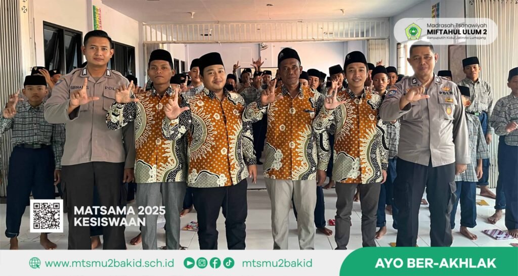 Kegiatan Masa Ta’aruf Siswa Madrasah (MATSAMA) MTs Miftahul Ulum 2 Banyuputih Kidul memasuki hari ketiga pada Rabu, 16 Juli 2025. Pada kesempatan ini, para peserta didik baru mendapatkan pembekalan penting mengenai Pencegahan Diskriminasi dan Bullying, yang disampaikan langsung oleh Tim Satuan Binmas Polres Lumajang.