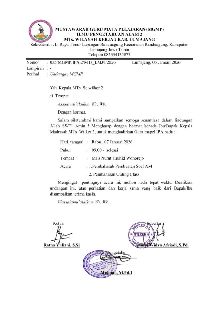 Guru MTs Miftahul Ulum 2 Banyuputih Kidul, Jatiroto, Lumajang Bardan Nafis, S.Pd, istiqamah mengikuti kegiatan Musyawarah Guru Mata Pelajaran (MGMP) Ilmu Pengetahuan Alam (IPA) MTs KKM Wilayah Kerja 2 Kabupaten Lumajang. Rabu (07/01/2026)