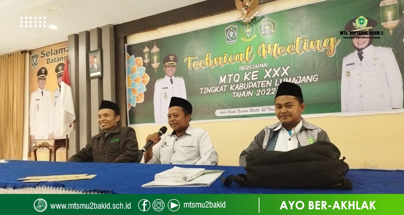 Kepala MTs. Miftahul Ulum 2 Banyuputih Kidul Jatiroto Lumajang, Sahroni, S.Pd.I., M.Pd menghadiri Technical Meeting MTQ tingkat Kabupaten Lumajang Ke XXX Tahun 2022, Rabu (23/11/22). Di samping kepala madrasah, anggota komite, Sahrul Hidayatulah, M.H. juga hadir menjadi salah satu anggota dewan hakim cabang MFQ