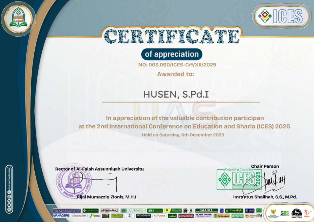 Atas partisipasi dan kontribusi ilmiahnya dalam kegiatan tersebut, beberapa guru menerima Certificate of Appreciation dengan nomor 003.060/ICES-Crf/XII/2025. Sertifikat tersebut diberikan sebagai bentuk penghargaan atas keterlibatan aktif dalam forum akademik internasional yang membahas isu-isu strategis di bidang pendidikan dan syariah.