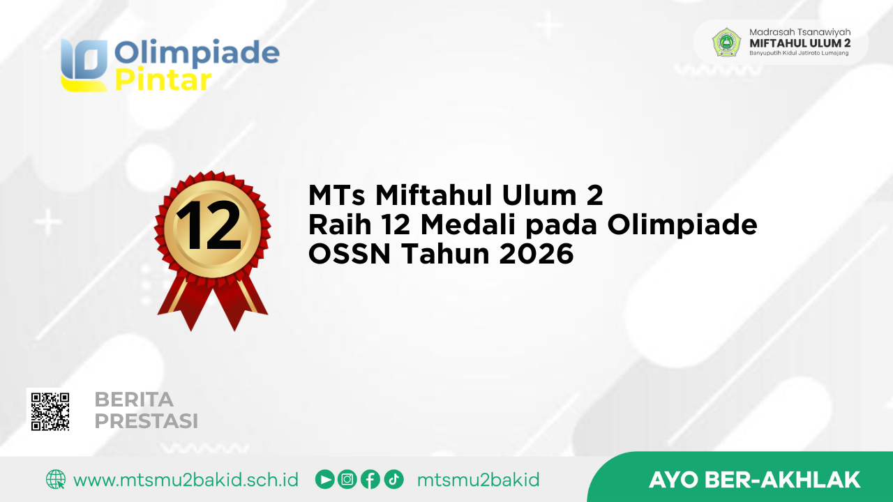 Dengan penuh rasa syukur, MTs Miftahul Ulum 2 kembali mencatatkan capaian membanggakan dalam ajang Olimpiade Sains Siswa Nasional (OSSN) Tahun 2026. Pada kompetisi tingkat nasional yang digelar pada Ahad, 11 Januari 2026 tersebut, para peserta didik berhasil meraih 12 medali emas dan 3 medali perak dari berbagai mata pelajaran yang dilombakan.