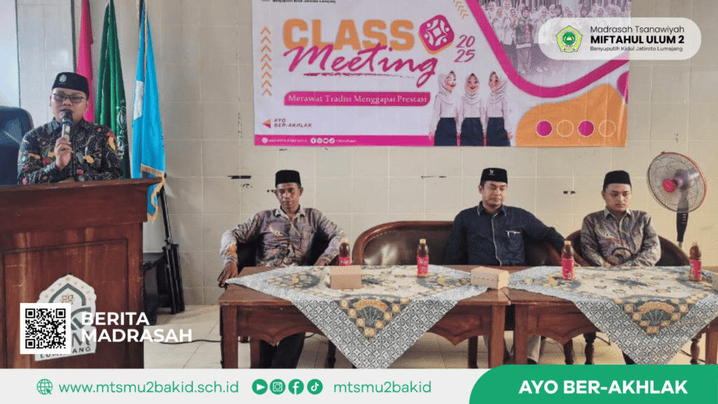 MTs Miftahul Ulum 2 Banyuputih Kidul menggelar acara Pembukaan Class Meeting Semester Ganjil Tahun Pelajaran 2025/2026 pada Selasa, 2 Desember 2025. Pembukaan berlangsung serentak di dua lokasi, yaitu Aula Madrasah Lantai 3 untuk peserta didik putra dan Aula Lantai 2 untuk peserta didik putri.