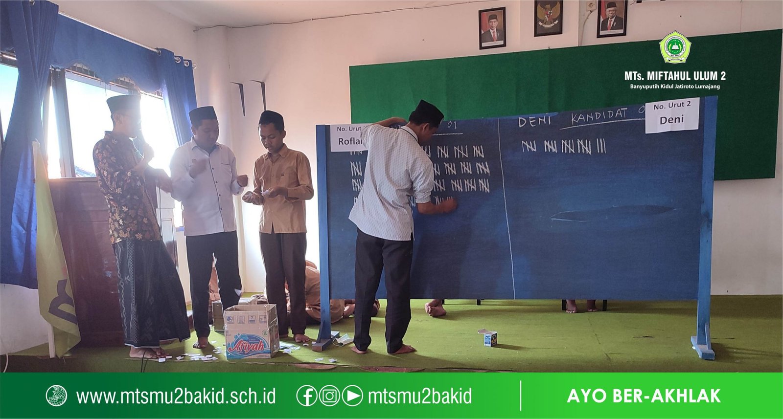 Ada hal yang berbeda di MTs. Miftahul Ulum 2 Banyuputih Kidul pada Hari Sabtu (14/08.22). Pasalnya untuk pertama kalinya para siswa menyelenggarakan pesta demokrasi melalui pemilihan Ketua OSIM untuk masa bakti 2021/2022. Pemilihan ketua OSIM digelar selayaknya Pemilu (Pemilihan Umum).