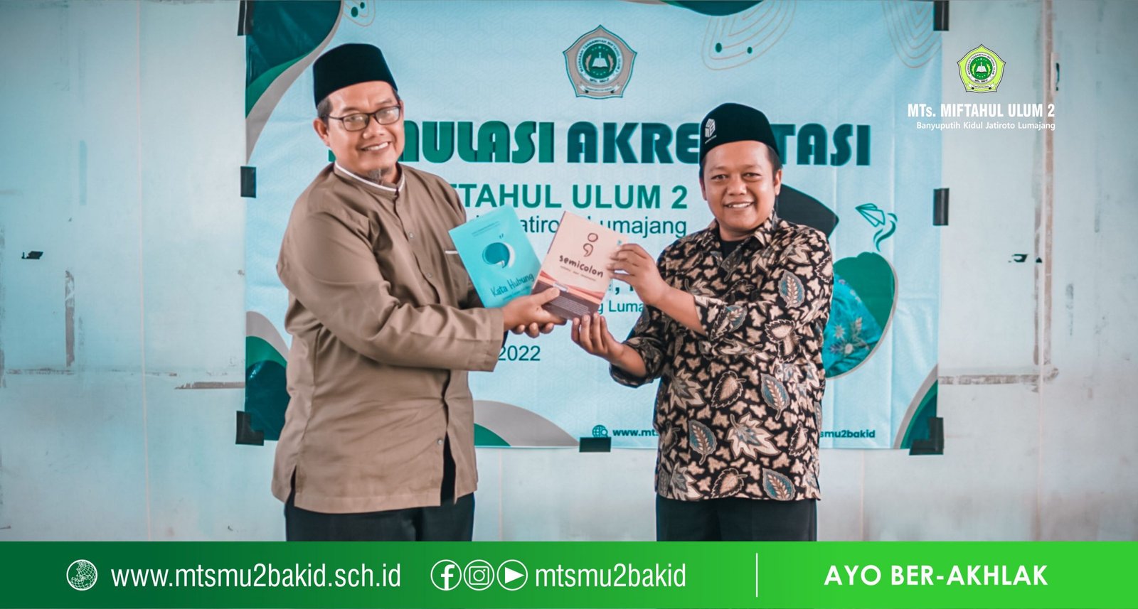 Setelah menyerahkan buku karya civitas madrasah kepada Perpustakaan Daerah Kabupaten Lumajang (16/06/22), Kepala MTs. Miftahul Ulum 2 Banyuputih Kidul, Sahroni, S.Pd.I., M.Pd kembali menyerahkan kedua buku yang berjudul Semicolon dan Kata Hubung kepada pengawas pembina madrasah, Drs. Achmad Junaedi, M.M.