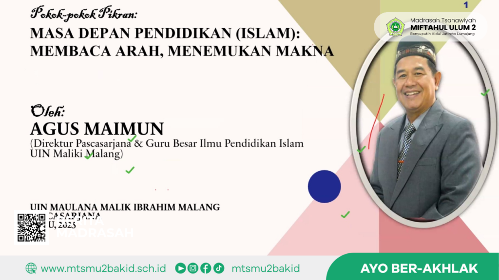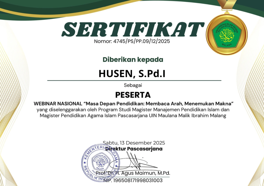 Plt Kepala MTs Miftahul Ulum 2 Banyuputih Kidul, Husen, S.Pd.I, mengikuti Webinar Nasional bertajuk “Masa Depan Pendidikan: Membaca Arah, Menemukan Makna” yang diselenggarakan oleh MMPI bekerja sama dengan MPAI UIN Maulana Malik Ibrahim Malang, pada Sabtu, 13 Desember 2025.