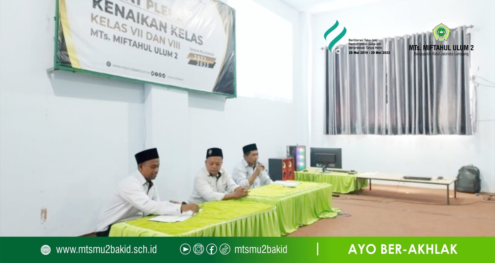 Kamis (22/06/23) MTs. Miftahul Ulum 2 Banyuputih Kidul Jatiroto Lumajang menggelar Rapat Kenaikan Kelas VII dan VIII Tahun Pelajaran: 2022/2023. Rapat yang digelar di Laboratorium Komputer Madrasah lantai 3 diikuti seluruh pimpinan madrasah, guru BK, dewan guru dan wali kelas.