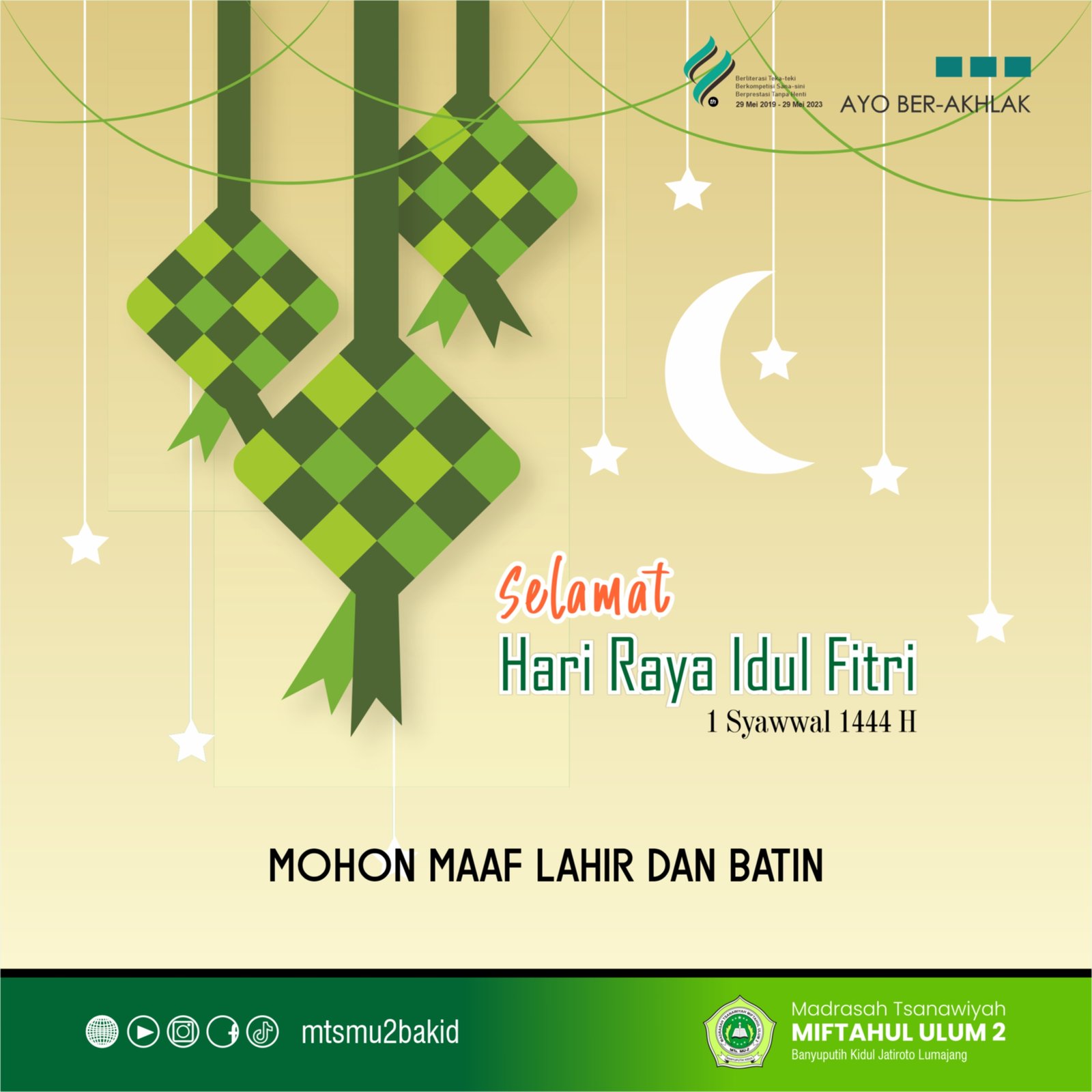 Idul Fitri 1444 H yang suci nan penuh rahmat menjadi satu penanda kemenangan menaklukkan diri. Dengan ketawadhu’an setiap individu yang berada di lingkungan MTs. Miftahul Ulum 2 Bakid terhadap kemuliaan Allah Yang Maha Pengasih, semoga apa yang dikandung lembaga ini baik itu jajaran manajerialnya, jajaran tenaga kependidikannya, siswa-siswi dan alumninya, serta para koleganya diberikan kesempatan untuk berprestasi memajukan kesejahteraan Bangsa-Negara Indonesia melalui jalur perjuangan pendidikan.