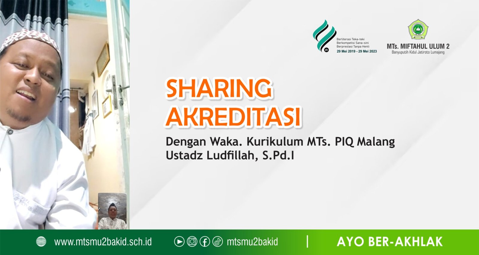Dalam sambungan video call WhatsApp, Ustadz Ludzfillah, S.Pd.I menyampaikan ucapan terimakasih kepada kepala MTs. Miftahul Ulum 2 yang telah berkenan melakukan komunikasi walaupun via daring. Pria yang selalu menemani Alm. KH. M. Basori Alwi saat mengajar Al-Qur’an di beberapa pesantren di Jawa Timur mengatakan ingin sharing pengalaman dengan MTs. Miftahul Ulum 2 Bakid saat menghadapi akreditasi terutama dalam tips-tips, strategi dan kendala yang dihadapi dalam penyiapan dokumen akreditasi dan lain sebagainya sehingga MTs. MU 2 langsung terakreditasi A.