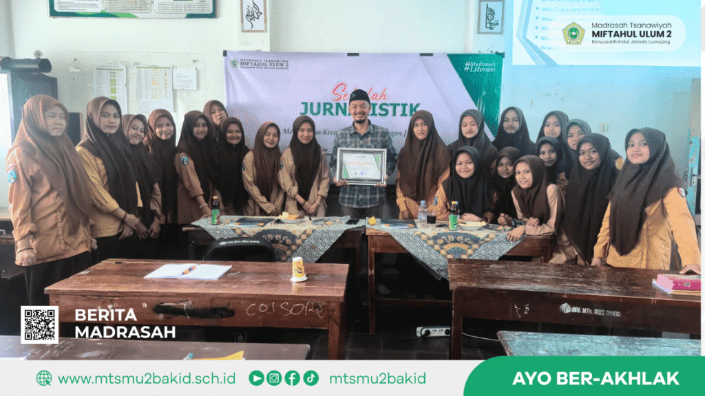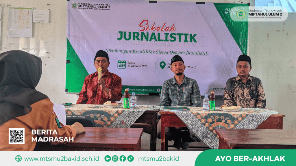 MTs Miftahul Ulum 2 Banyuputih Kidul, Jatiroto, Lumajang, menyelenggarakan kegiatan Sekolah Jurnalistik bagi siswi dengan tema “Membangun Kreativitas Siswa dengan Jurnalistik” pada Sabtu (17/1/2026). Kegiatan ini dilaksanakan di Aula Madrasah Putri sebagai tindak lanjut dari penandatanganan Nota Kesepahaman (MoU) antara MTs Miftahul Ulum 2 dan Lumajangsatu yang dilaksanakan pada hari yang sama.
