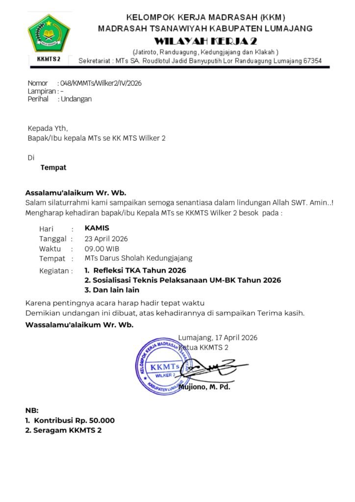 MTs Miftahul Ulum 2 Banyuputih Kidul tetap menunjukkan komitmennya dalam mengikuti forum koordinasi madrasah dengan menghadiri kegiatan pertemuan Kelompok Kerja Madrasah Tsanawiyah (KKMTs) Wilayah Kerja 2 yang dilaksanakan pada Kamis (23/4/2026).