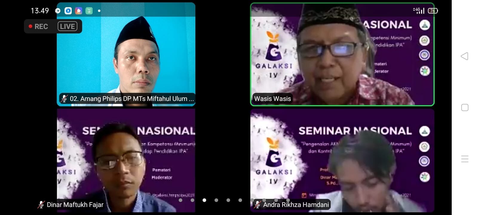 Acara webinar diawali dengan sambutan singkat dari Ketua Himpunan mahasiswa program studi Tadris IPA, Badrud Tamam yang kemudian dilanjutkan dengan sambutan kedua oleh Kepala Program Studi/ Kaprodi Tadris IPA, Andi Suhardi, ST, MM dalam sambutannya beliau menyampaikan bahwa seminar ini merupakan salah satu kegiatan yang dibingkai dalam satu paket kegiatan rutin/ tahunan dan tahun ini adalah tahun yang keempat, kegiatan lainnya yaitu Olimpiade dan Produk sains tingkat MTs, untuk kegiatan seminar selalu mencoba mengangkat tema yang berpijak pada isu-isu yang baru dan tahun ini isu yang hangat adalah mengenai AKM/ ANBK sehingga dengan diseminarkan diharapkan dapat menambah wawasan bagi masyarakat luas, terakhir yang beliau sampaikan adalah permohonan maaf apabila dalam penyelenggaraan seminar ini ada hal-hal yang tidak berkenan di hati para undangan dan peserta seminar mohon untuk dimaklumi karena masih dalam masa pandemi sehingga tidak bisa menyelenggarakan seminar yang bersifat tatap muka.